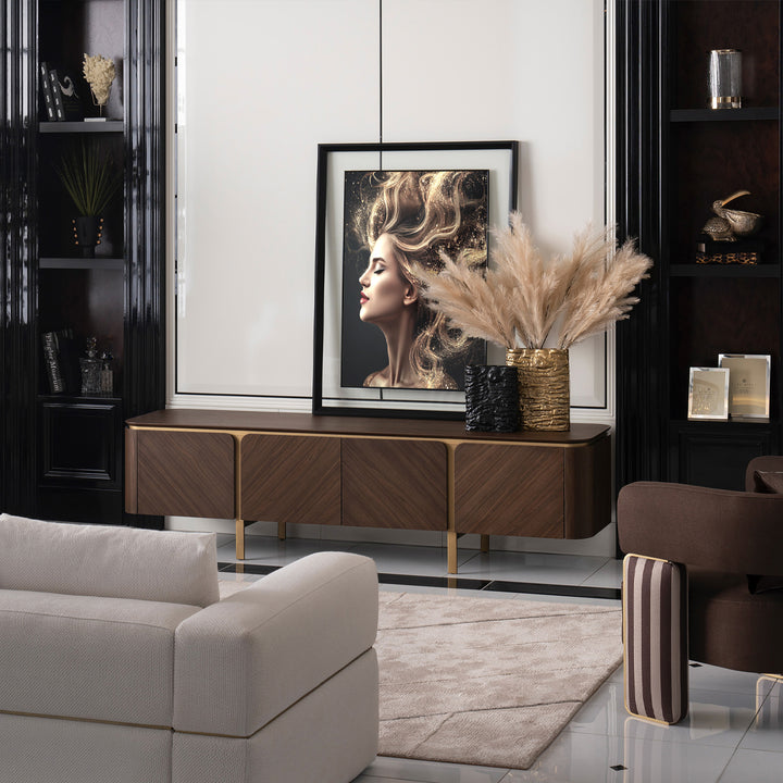 • Powder-coated brushed brass accents contrast with the rich walnut finish, adding depth and texture to the cabinet